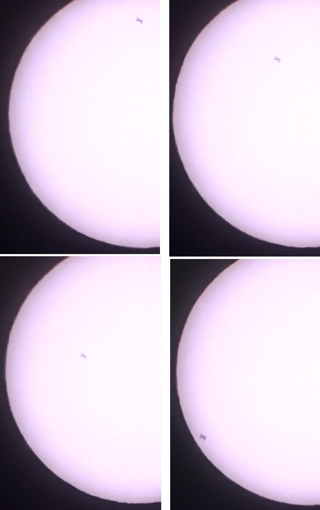 Endlich hat es geklappt...trotz ständig durchziehender Wolken konnte die Internationale Raumstation (ISS, International Space Station) beobachtet werden, während sie an der Sonne vorbeiflog.In der entscheidenden Sekunde war der Blick frei und der Transit der ISS war sichtbar. Es konnten aus einem Video 14 Einzelbilder herausgezogen werden, die zeigen, wie die ISS mit Alexander Gerst an Bord (... [mehr]
