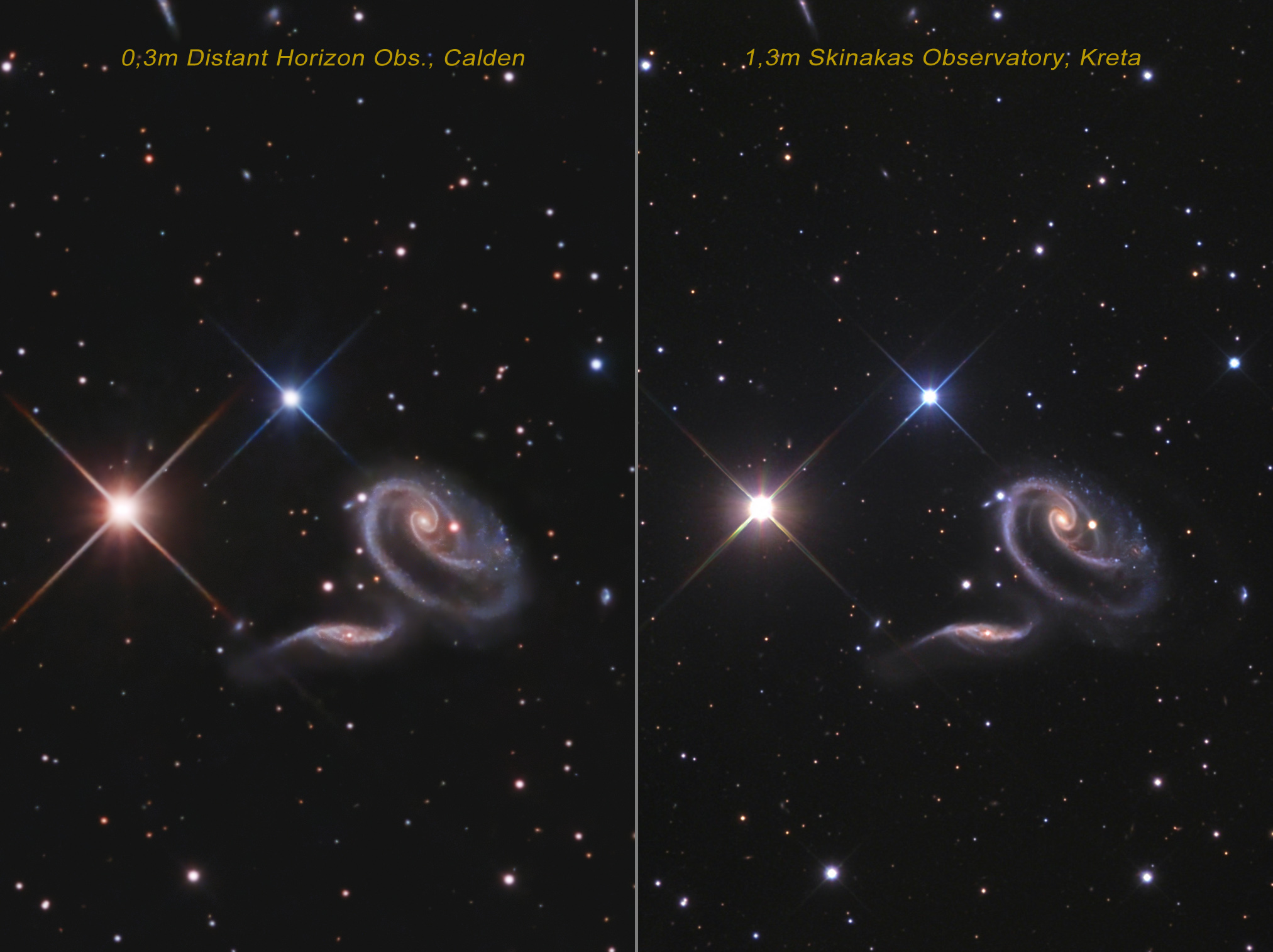 Dietmar Gutermuth hat in Calden wieder ein schönes Foto eines Galaxienpaars aufgenommen. Er schreibt dazu:Arp 273 ist ein interagierendes Galaxienpaar im Sternbild Andromeda, in einer Entfernung von etwa 340 Millionen Lichtjahren. Es handelt sich hierbei um eine typische Doppelgalaxie mit verbundenen Armen, wobei wahrscheinlich die kleinere der Beiden die größere durchquert hat. Aufgrund... [mehr]